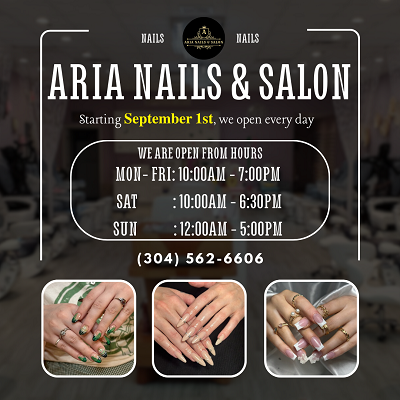 ARIA NAILS & SPA is the IDEAL destination for nail services in the center of HURRICANE WV 25526. We are dedicated to bring TOP line products mixed with EXPERT technique to the nail salon industry and an AFFORDABLE price. Our specialties includes Nails, Pedicure, Manicures, Dipping Powder, Waxing, Facials and Eyelashes.